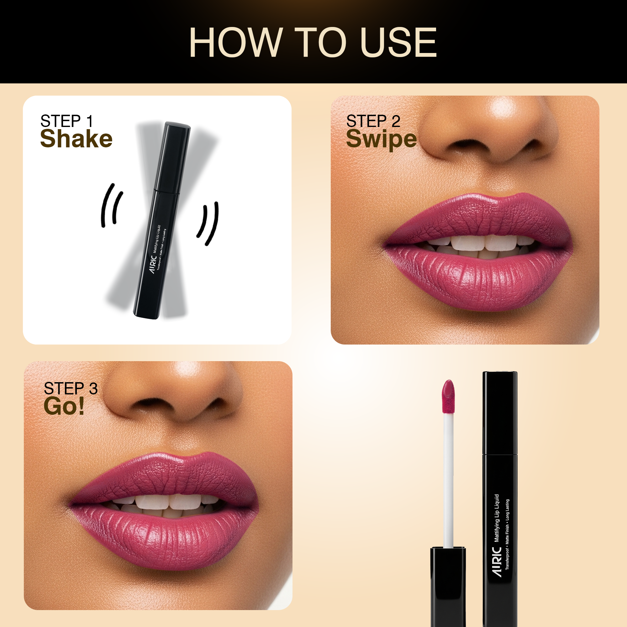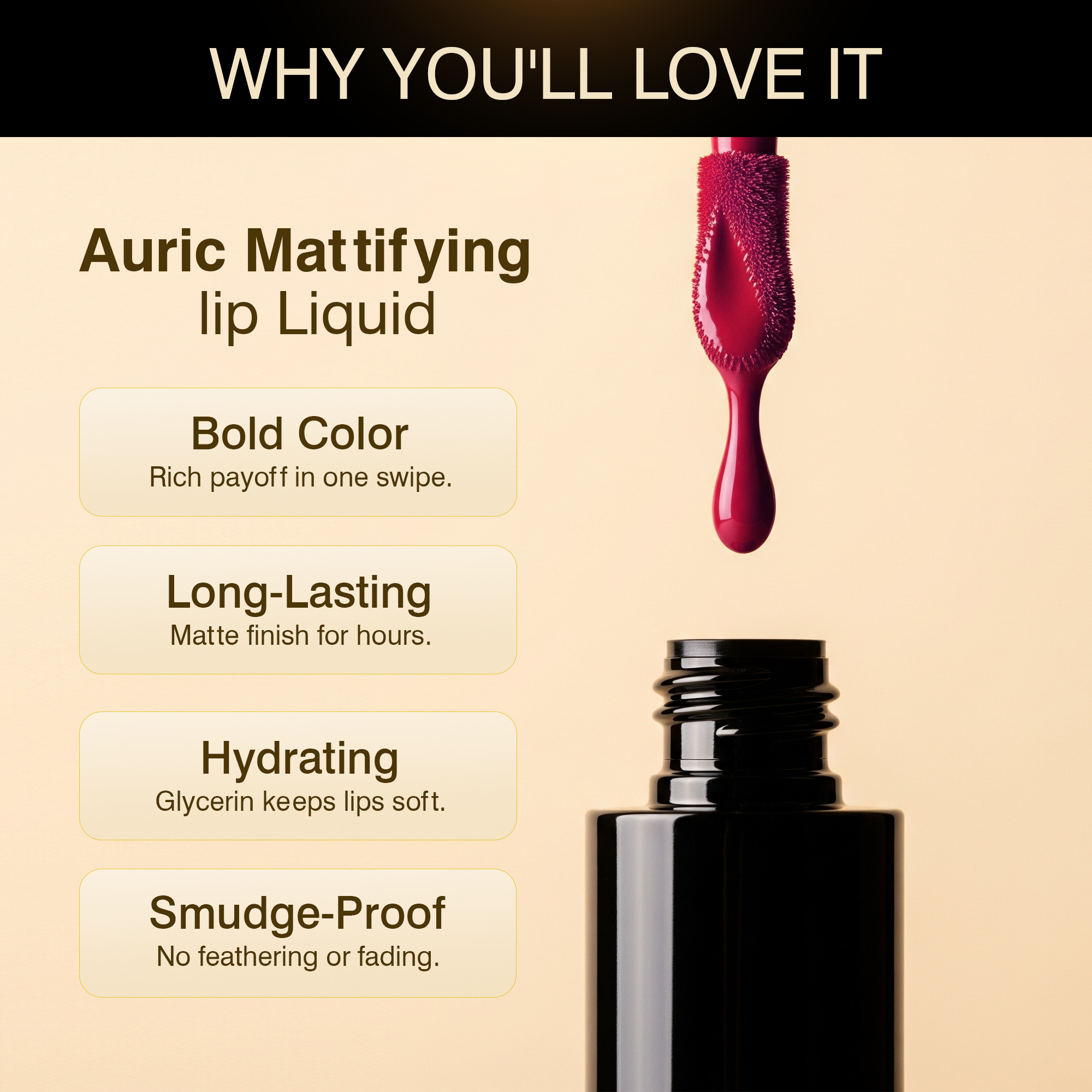 Auric Mattifying Lip Liquid adds a long-lasting velvety texture to keep your lips looking gorgeous as ever. Its high density pigments take your lips from gorgeous to ‘wow’ with an intense rich colour payoff on one swipe application. Boosted with cross linked silicon for long lasting matte finish. Infused with Glycerin, for an added moisturization to your lips.